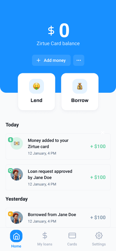 Redefined how Zirtue communicates trust in peer-to-peer lending. The redesign turned a confusing, transactional experience into one that feels secure, human, and transparent, increasing user confidence while supporting business goals like repeat lending and bill-pay expansion.